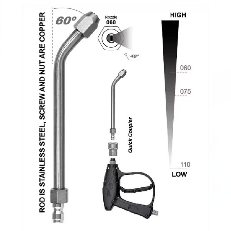 การออกแบบขนาดของหัวฉีดงอนี้มีความแม่นยำงอ 60 องศาด้วยการออกแบบหลุมทางออก Dia.060 40 องศาการออกแบบมุมพิเศษนี้สามารถเข้าถึงพื้นที่ภายในแคบ ๆ ของเครื่องปรับอากาศเพื่อทำความสะอาดได้อย่างง่ายดาย การดำเนินการอาจมีความยืดหยุ่นมาก ข้อกำหนดของหัวฉีดคือ 060 และมุมของหัวฉีดคือ 40 องศาดังนั้นจึงสามารถสร้างการไหลของน้ำที่เหมาะสมสำหรับการล้างในการทำความสะอาด Nilfisk และ WAP เป็นอุปกรณ์ทำความสะอาดที่มีชื่อเสียงมาก ปืนซักผ้าสองยี่ห้อนี้มีการไหลของน้ำแรงดันสูงที่มีเสถียรภาพและสามารถควบคุมการทำความสะอาดได้อย่างแม่นยำดังนั้นพวกเขาจึงใช้กันอย่างแพร่หลายในการทำความสะอาดงานในหลาย ๆ สถานการณ์ หัวฉีดงอของ Genuinsky เหมาะกับปืน WAP/Nilfisk ดังนั้นจึงสามารถทำความสะอาดเครื่องปรับอากาศได้อย่างสะดวกด้วยความร่วมมือของทั้งสองฝ่ายและสามารถทำความสะอาดฝุ่นและสิ่งสกปรกภายในเครื่องปรับอากาศได้อย่างมีประสิทธิภาพมากขึ้น การทำความสะอาดเครื่องปรับอากาศตรงเวลาไม่เพียง แต่สำหรับคนเท่านั้นที่ดีต่อสุขภาพและยังสามารถยืดอายุการใช้งานของเครื่องปรับอากาศด้วยตัวเอง