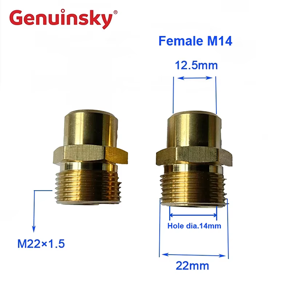 การติดตั้งท่อทองเหลืองเหมาะสำหรับอุปกรณ์ซักผ้าแรงดันสูง ก่อนอื่นมาเริ่มต้นด้วยขนาดของผลิตภัณฑ์เอง ปลายด้านหนึ่งคือด้ายชาย M22 × 1.5 โดยมีเส้นผ่านศูนย์กลาง 22 มม. และรู Dia.14mm ที่ปลายอีกด้านคือด้ายหญิง M14 มีเส้นผ่านศูนย์กลาง 12.5 มม. สามารถใช้กับเครื่องทำความสะอาดแรงดันสูงที่เหมาะสมตามความต้องการ