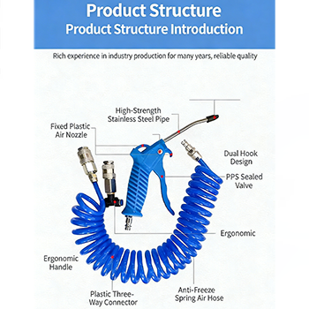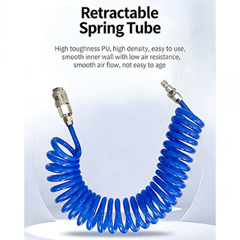 หลอดลมสปริงยืดไสลด์ในชุดทำจากวัสดุ PU และมีสามสีให้เลือก: ดำ, น้ำเงินและแดง ผนังด้านในของวัสดุ PU ที่มีความทนทานสูงนั้นเรียบ ซึ่งทำให้ความต้านทานลมลดลงและการไหลเวียนของอากาศจะราบรื่นขึ้น ในเวลาเดียวกัน วัสดุ PU มีความต้านทานการสึกหรอและการเสื่อมสภาพที่ดีเยี่ยม และแรงดันใช้งานสามารถเข้าถึง 1,000 Mpa ซึ่งสามารถให้การไหลเวียนของอากาศที่แข็งแกร่งในงานกำจัดฝุ่น ทำให้งานกำจัดฝุ่นมีประสิทธิภาพมากขึ้น ข้อต่อสวมเร็วที่ปลายทั้งสองข้างของหลอดลมก็ใช้งานได้จริงเช่นกัน การออกแบบปลั๊กอินไม่จำเป็นต้องใช้เครื่องมือ และการเชื่อมต่อกับปืนลมและแหล่งอากาศสามารถทำได้ภายในไม่กี่วินาที ซึ่งช่วยเพิ่มประสิทธิภาพการทำงานได้อย่างมาก