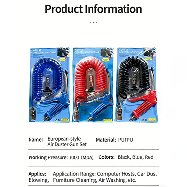 ชุดปืนเป่าลมแบบนิวแมติกสไตล์ยุโรปประกอบด้วยปืนฉีดฝุ่น หลอดลมแบบสปริงยืดไสลด์ และข้อต่อสวมเร็ว ซึ่งสามารถประกอบและใช้งานได้อย่างรวดเร็วตราบใดที่ไม่ได้แกะกล่อง ปืนฉีดฝุ่นมีจำหน่ายในสีดำ สีน้ำเงิน และสีอื่นๆ ตัวเครื่องใช้กระบอกสแตนเลสทรงเรียว การออกแบบนี้ทำให้อุปกรณ์สามารถเข้าถึงช่องว่างแคบๆ ที่ไม่สามารถทำความสะอาดได้ง่าย เช่น แป้นคีย์บอร์ด ช่องว่างภายในรถ และช่องเครื่องปรับอากาศ หรือการทำความสะอาดชิ้นส่วนเครื่องจักรอุตสาหกรรม ด้วยหัวฉีดลมพลาสติกแบบตายตัว กระแสลมที่กวาดจึงมีความเข้มข้นมากขึ้นและสามารถกำจัดฝุ่นได้อย่างแม่นยำ ตัวปืนใช้ด้ามจับตามหลักสรีรศาสตร์ ซึ่งไม่เพียงแต่พอดีกับฝ่ามือเท่านั้น ทำให้ผู้ใช้รู้สึกสบายขึ้น แต่ยังสามารถถือด้วยมือเดียวเพื่อขจัดฝุ่น และไม่ง่ายที่จะรู้สึกเหนื่อยแม้ว่าคุณจะใช้มันเป็นเวลานานก็ตาม ด้ามจับยังมีรูปแบบกันลื่นที่ออกแบบมาอย่างดี ซึ่งสามารถปรับปรุงความมั่นคงของด้ามจับและไม่ลื่นหลุดง่าย ตัวปืนทำจากพลาสติกเสริมความหนาแน่นสูงซึ่งมีความแข็งสูง เมื่อเผชิญกับการกระแทกและเสียดสีในการใช้งานประจำวันจึงไม่แตกหักง่ายทำให้ผลิตภัณฑ์มีความทนทานมากขึ้น และความหนาแน่นของวัสดุนั้นต่ำกว่าโลหะมาก ซึ่งทำให้ปืนฉีดฝุ่นทั้งหมดเบาและพกพาได้มากกว่า สามารถรองรับการเชื่อมต่อแบบนิวแมติก และด้วยหลอดลมส่วนบนและแหล่งอากาศ กระแสลมที่สร้างขึ้นจะแข็งแกร่งขึ้น ซึ่งสามารถตอบสนองการทำความสะอาดรายวันและการบำรุงรักษาทางอุตสาหกรรม ตั้งแต่การกำจัดฝุ่นเล็กน้อยไปจนถึงการกำจัดฝุ่นในระดับปานกลาง