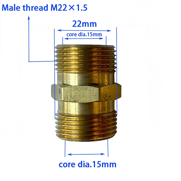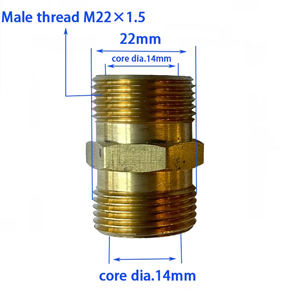 การออกแบบขนาดของขั้วต่อตัวผู้ทองเหลือง M22 รู 14/15 มม. ตัวเลือกนี้เข้มงวดมาก ปลายด้านหนึ่งของผลิตภัณฑ์คือเกลียวตัวผู้ M22×1.5 มีเส้นผ่านศูนย์กลาง 22 มม. และมีข้อกำหนดสองประการ สามารถเลือกรูรับแสงได้ อันหนึ่งคือเส้นผ่านศูนย์กลางหลัก 14 มม. และอีกอันคือเส้นผ่านศูนย์กลางหลัก 15 มม. สเปคของ M22×1.5 เป็นมาตรฐานทั่วไปของอุปกรณ์หลายชนิด จึงสามารถจับคู่กับอุปกรณ์อุตสาหกรรมหลายประเภทได้อย่างกว้างขวาง รูปแบบของแกนขนาดเส้นผ่านศูนย์กลาง 14 มม. เหมาะสำหรับเครื่องฉีดน้ำแรงดันสูงแรงดันปานกลางและส่วนประกอบไฮดรอลิกขนาดเล็กบางชนิด ฯลฯ ข้อกำหนดการไหลของอุปกรณ์เหล่านี้ค่อนข้างปานกลาง และเส้นผ่านศูนย์กลางรูรับแสงตรงตามข้อกำหนด รูปแบบของแกนขนาดเส้นผ่านศูนย์กลาง 15 มม. เหมาะสำหรับอุปกรณ์ทำความสะอาดแรงดันสูงที่มีการเคลื่อนที่ขนาดใหญ่หรือสถานการณ์ท่อส่งของเหลวเชิงกลขนาดใหญ่ มีความต้องการการส่งกระแสข้อมูลขนาดใหญ่ในสาขาเหล่านี้ ดังนั้นรูรับแสงจึงสามารถตอบสนองความต้องการได้ วัสดุของผลิตภัณฑ์คือทองเหลือง ข้อได้เปรียบที่โดดเด่นของทองเหลืองคือความต้านทานการกัดกร่อน ในสภาพแวดล้อมการทำงานของผลิตภัณฑ์ มักจะต้องเผชิญกับสารเคมี เช่น น้ำ น้ำมัน หรือผงซักฟอกเป็นเวลานาน ง่ายต่อการตอบสนองในสภาพแวดล้อมการทำงานที่ชื้นและซับซ้อน ทองเหลืองสามารถคงความเสถียรในสภาพแวดล้อมนี้เป็นเวลานานเพื่อหลีกเลี่ยงการกัดกร่อนและสนิม ความเสี่ยงจากการรั่วไหล ในขณะเดียวกัน ทองเหลืองยังมีคุณลักษณะที่มีความแข็งแรงสูง ซึ่งสามารถทนต่อแรงดันช็อตระหว่างการส่งไฟฟ้าแรงสูง และไม่แตกหักง่ายในงานทำความสะอาดแรงดันสูง
