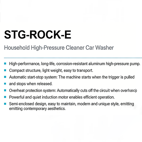 แบบแรก STG-ROCK-80E เป็นแบบบ้านขั้นพื้นฐาน มีกำลังไฟ 1000W แรงดันสูงสุด 80Bar แรงดันใช้งาน 55Bar อัตราการไหล 6.5/7.5 ลิตร/นาที และน้ำหนักเครื่องทั้งหมด 10 กก. โดยพื้นฐานแล้วมันเป็นเครื่องทำความสะอาดที่ใช้พลังงานต่ำและสะดวกสบายสูง ซึ่งสามารถครอบคลุมความต้องการในการทำความสะอาดบ้านได้อย่างง่ายดาย ตั้งแต่การทำความสะอาดรถยนต์ไปจนถึงคราบพื้นและผนัง เหมาะสำหรับผู้ใช้ทำความสะอาดตามบ้านที่ต้องการแสงและใช้งานง่าย
