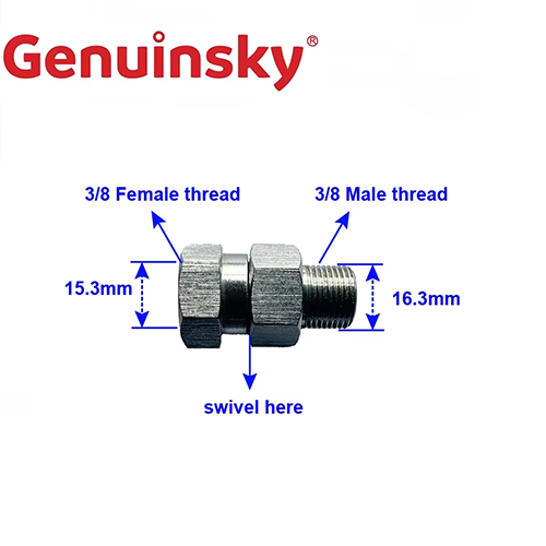 สแตนเลสสตีลหมุนตัวนี้เป็นด้ายหญิง 3/8 ที่ปลายด้านหนึ่งมีเส้นผ่านศูนย์กลางประมาณ 15.3 มม. และด้ายชาย 3/8 ที่ปลายอีกด้านหนึ่งมีเส้นผ่านศูนย์กลางประมาณ 16.3 มม. โดยเฉพาะอย่างยิ่งส่วนตรงกลางสามารถหมุนได้ คุณสมบัตินี้สามารถปรับให้เข้ากับท่อแรงดันสูงและปืนพ่นของอุปกรณ์ซักผ้า ในการดำเนินการทำความสะอาดสามารถปรับมุมต่าง ๆ ตามการใช้งานซึ่งสามารถแก้ปัญหาการบิดเบือนท่อ ด้วยโครงสร้างการหมุนการเชื่อมต่อที่ยืดหยุ่นสามารถรับรู้ได้