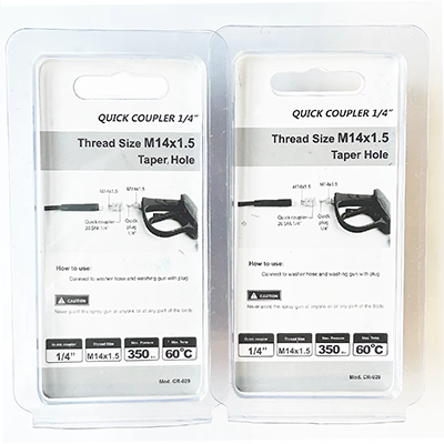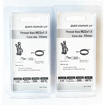 ข้อต่อ 1/4 ของสเปคทั้งสองนี้มีการออกแบบขนาดแตกต่างกัน หนึ่งคือ M22×1.5 โดยมีเส้นผ่านศูนย์กลาง 22 มม. ซึ่งแกนมีเส้นผ่านศูนย์กลาง 15 มม. อีกอันคือ M14×1.5 โดยมีเส้นผ่านศูนย์กลาง 14 มม. และมีรูเทเปอร์ การออกแบบผลิตภัณฑ์ทั้งสองขนาดมีความแม่นยำมาก ซึ่งสามารถปรับให้เข้ากับเครื่องทำความสะอาดที่เกี่ยวข้องได้อย่างแม่นยำ และใช้สำหรับขั้วต่อท่อปืนฉีดน้ำแรงดันสูง วัสดุของผลิตภัณฑ์คือทองเหลือง วัสดุทองเหลืองมีความทนทานต่อการกัดกร่อนได้ดี งานทำความสะอาดแรงดันสูงมักต้องเผชิญกับสภาพแวดล้อมที่ชื้น ดังนั้นความต้านทานการกัดกร่อนของผลิตภัณฑ์จึงสามารถทำงานได้ตามปกติในสภาพแวดล้อมการทำงานที่รุนแรงต่างๆ ในขณะเดียวกัน ทองเหลืองมีความเหนียวและความแข็งที่ดีและในการไหลของน้ำแรงดันสูง ความทนทานของผลิตภัณฑ์ยังสามารถรักษาไว้ได้เมื่อรับแรงกระแทกและไม่แตกหักง่ายจึงทำให้เกิดน้ำรั่วและลดต้นทุนในการเปลี่ยนอุปกรณ์ สถานการณ์การใช้งานทั่วไป ได้แก่ การทำความสะอาดบ้าน การทำความสะอาดอุปกรณ์อุตสาหกรรม หรือการทำความสะอาดสิ่งอำนวยความสะดวกกลางแจ้ง ในระหว่างกระบวนการทำความสะอาดเหล่านี้ สามารถติดตั้งหรือถอดชิ้นส่วนได้อย่างรวดเร็ว ผู้ใช้สามารถทำงานเชื่อมต่อได้อย่างรวดเร็วโดยไม่ต้องใช้เครื่องมือช่วย ซึ่งช่วยปรับปรุงประสิทธิภาพการทำงานอย่างมากและประหยัดเวลา ในขณะเดียวกัน ขนาดของข้อต่อ 1/4 ของข้อกำหนดทั้งสองนี้ก็เหมาะสมมากเช่นกัน ผู้ใช้สามารถดำเนินการเชื่อมต่อได้อย่างง่ายดายและยืดหยุ่นด้วยมือเดียว